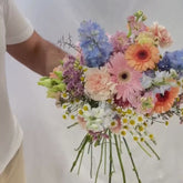- Flores Principales: Gerberas anaranjadas y rosadas, delphiniums azules, margaritas blancas, claveles rosados.